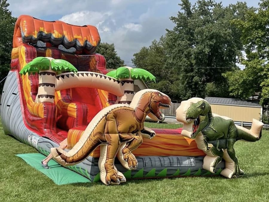 Bring prehistoric fun to your next event with the 16’ Dino Slide. This tropical dinosaur-themed inflatable features erupting lava artwork, bright colors, and a long, thrilling run that kids and teens love. Perfect for family get-togethers, birthday parties, school events, and charity fundraisers. Water slide rentals 16’ Dino Slide in All of Louisville and surrounding areas, southern Indiana and surrounding areas.